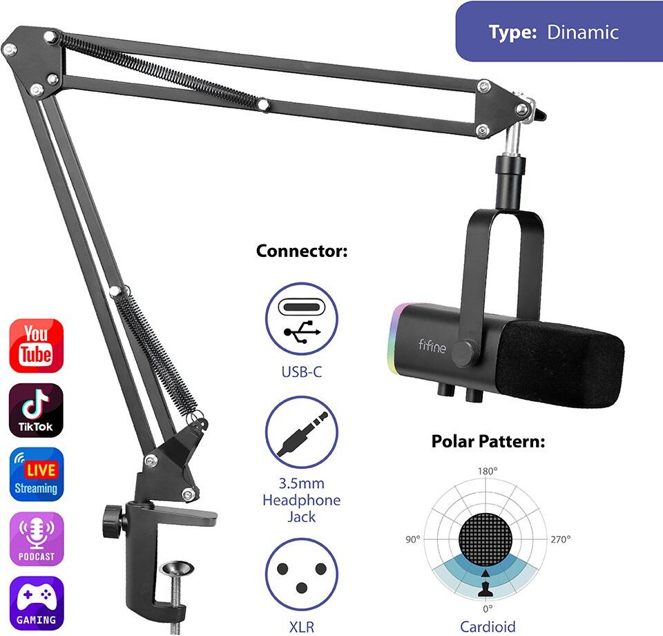 Микрофон със стойка FIFINE AM8T Dynamic RGB - Black