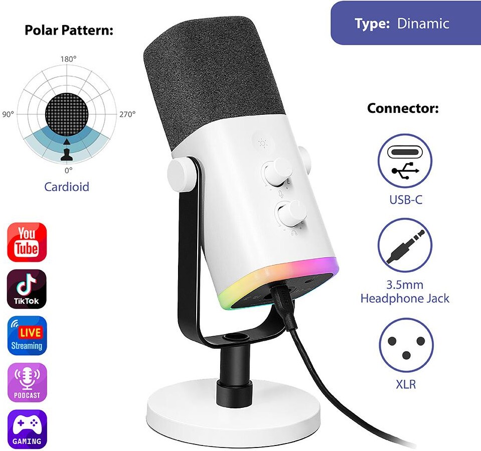 Настолен микрофон FIFINE AM8 Dynamic RGB XLR/USB - White