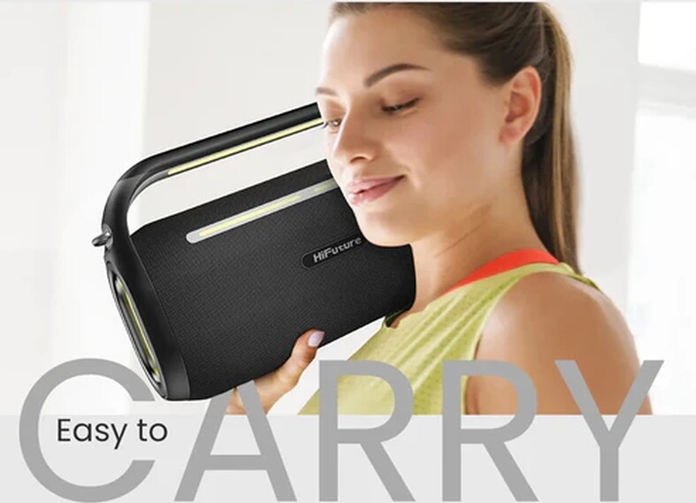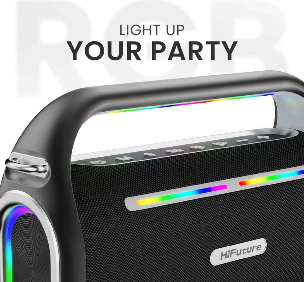 HiFuture MusicBox100 е преносима Bluetooth тонколона, идеална за приключения на открито и партита, която предлага впечатляващ 70W звук в компактен дизайн. Тя разполага с мощен DSP процесор и многобандов еквалайзер, които позволяват оптимално аудио представяне според вашите предпочитания. Вградената батерия с капацитет от 8000 mAh осигурява дълго време на възпроизвеждане, а функцията за външна батерия с изход 5V/1A ви позволява да зареждате други устройства в движение. Динамичните RGB светлини, синхронизирани с музиката, добавят визуален ефект и създават парти атмосфера. Тонколоната поддържа Bluetooth 5.3 за стабилна и бърза безжична връзка, както и TWS за сдвояване на две устройства за по-обгръщащо звучене. Вграденият микрофон осигурява приемане на обаждания директно през тонколоната, а включените два отделни безжични микрофона и дистанционно управление превръщат MusicBox100 в отлично решение за караоке и забавление с приятели.