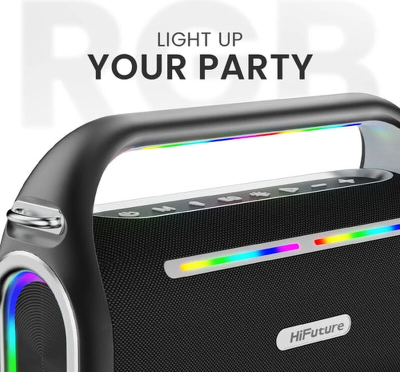 HiFuture MusicBox200 е преносима Bluetooth тонколона, създадена за партита и приключения на открито, която комбинира компактен дизайн с впечатляваща звукова мощност от 100W. Оборудвана е с усъвършенстван DSP процесор и многобандов еквалайзер, позволяващи оптимално настройване на звука според индивидуалните предпочитания. Вградената батерия с капацитет от 12000 mAh осигурява продължително време на възпроизвеждане, а функцията за външна батерия с изход 5V/1A ви позволява да зареждате други устройства в движение. Динамичните RGB светлини, синхронизирани с ритъма на музиката, допринасят за впечатляващ визуален ефект и истинска парти атмосфера. Тонколоната поддържа Bluetooth 5.3 за бърза и стабилна безжична връзка, както и TWS функция за сдвояване на две тонколони за по-пълноценно звуково изживяване. Вграденият микрофон позволява провеждане на разговори директно през устройството, а включените два безжични микрофона и дистанционно управление превръщат MusicBox200 в отличен избор за караоке и забавления с приятели.