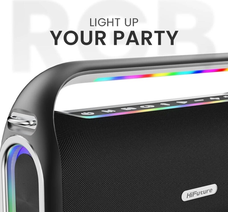 HiFuture MusicBox300 е преносима Bluetooth тонколона, създадена за партита и приключения на открито, която съчетава компактен и стилен дизайн с впечатляваща звукова мощност от 150W. Оборудвана е с усъвършенстван DSP процесор и многобандов еквалайзер, които позволяват прецизно настройване на звука според личните ви предпочитания. Вградената батерия с капацитет от 18000 mAh осигурява дълго време на непрекъснато възпроизвеждане, а функцията за външна батерия с изход 5V/1A позволява удобно зареждане на други устройства в движение. Динамичните RGB светлини, синхронизирани с ритъма на музиката, създават впечатляващ визуален ефект и истинска парти атмосфера. Тонколоната поддържа Bluetooth 5.3 за бърза и стабилна безжична връзка, както и TWS функция за свързване на две тонколони за по-пълноценно звуково преживяване. Вграденият микрофон позволява провеждане на разговори директно през устройството, а включените два безжични микрофона и дистанционно управление превръщат MusicBox300 в отлично решение за караоке и забавления с приятели.