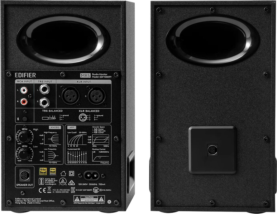 Edifier MR5 Active Studio Monitors (Tri-amped), BT V6.0, Balanced XLR, Balanced TRS, RCA and AUX, which headphone output, 5-inch woofers, 3.75-inch mid-range drivers, and 1-inch silk dome tweeters, 110W (RMS), Room Acoustic Compensation, Black