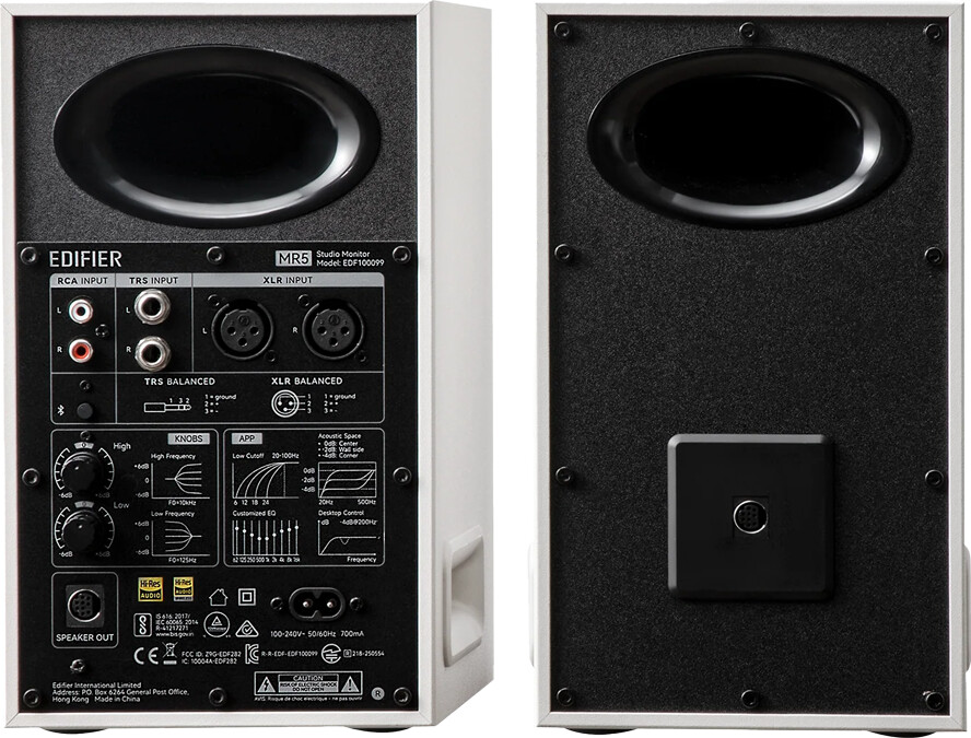 Edifier MR5 Active Studio Monitors (Tri-amped), BT V6.0, Balanced XLR, Balanced TRS, RCA and AUX, which headphone output, 5-inch woofers, 3.75-inch mid-range drivers, and 1-inch silk dome tweeters, 110W (RMS), Room Acoustic Compensation, White