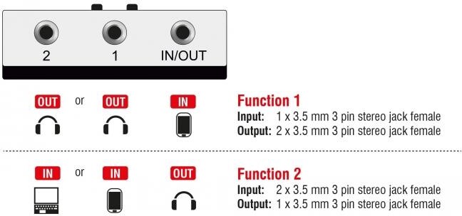• Конектори: Функция 1 Вход: 1 x 3,5 mm 3-pin стерео жак женско Изход: 2 x 3.5 mm 3 pin стерео жак женско Функция 2 Вход: 2 x 3.5 mm 3 pin стерео жак женскo Изход: 1 x 3.5 mm 3 pin стерео жак женскo • 2 механични бутона • Пластмасов корпус • Не е необходимо външно захранване • Размери: ca. 112 x 68 x 29 mm (без бутоните) • Цвят: сив / черен