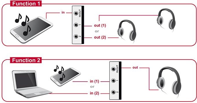 1. Свързване на 2 възпризвеждащи устройства(слушалки) към 1 аудио източник. С помощта на бутон може да изберете устройството, което да възпроизведе аудио сигнала. (Едновременното извеждане сигнала на двата изхода е невъзможно)