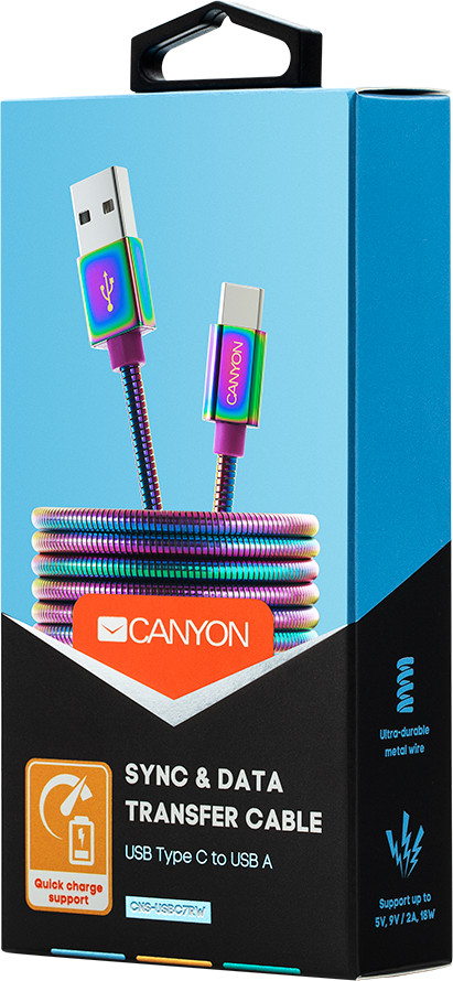 CANYON Type C USB 2.0 standard cable, Power output 5V/9V 2A, OD 3.8mm, metal shell, cable length 1.2m, Rainbow, 14*6*1000mm, 0.0