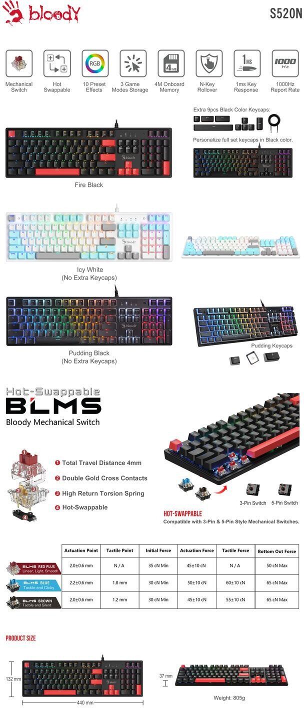 Геймърска механична клавиатура A4tech Bloody S520N Fire Black - BLMS Red Plus Switch
