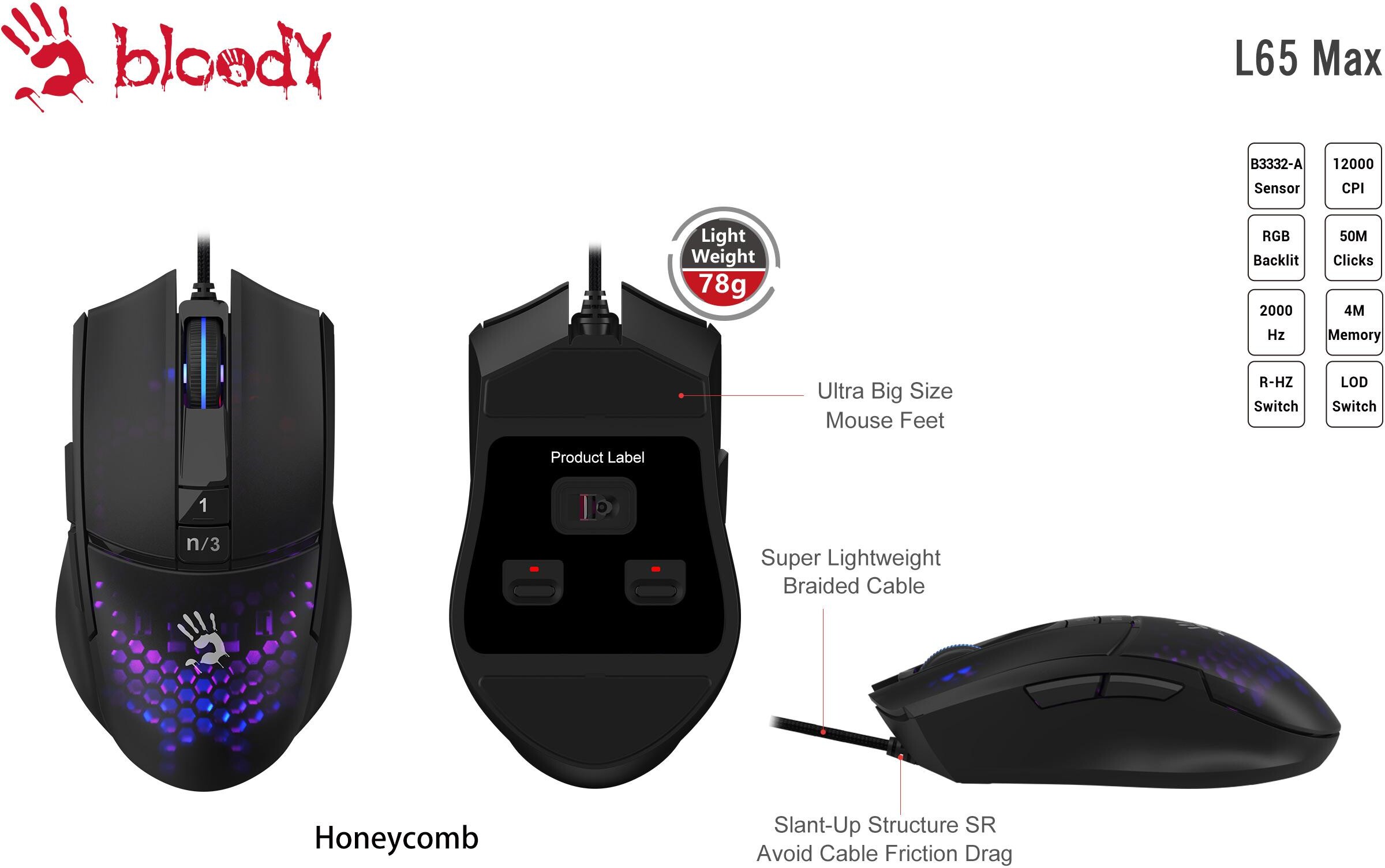 Геймърска мишка A4tech bloody L65 Max, Жична, 12000 cpi, Honeycomb,Черна