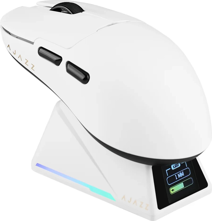 Magnetic Charging Base with Customizable Display Triple Modes Connection & High Polling Reate Efficient 400mAh Battery with Low-Power Consumption AJ159 APEX can be overclocked to 42,000 DPI, alongside a tracking speed of 750 IPS and 50G acceleration 100 Million Clicks Micro Switch