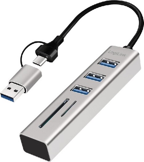 Expand the functionality of your device in an instant with the LogiLink USB-C 3-port hub with card reader. This compact and portable solution is ideal for instantly adding three USB-A ports as well as an SD and microSD card reader to your USB-C or Thunderbolt 3/4-enabled laptop, smartphone or tablet. Thanks to the versatile 2-in-1 connection cable, you can connect the hub to both modern USB-C and conventional USB-A devices.