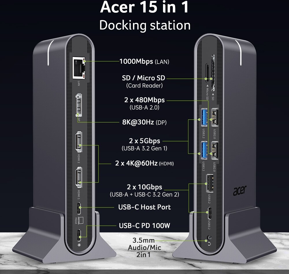Докинг станция Acer Type C Universal docking station 15in1, 2 x HDMI 4K@60Hz, 1 x DP 8k@30Hz, 5 x USB A, 1 x USB C, 1 x RJ45, 1x