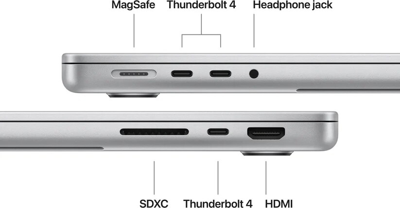 | Разширителен порт: | 3 Thunderbolt 4 (USB-C) ports with support for: Charging, DisplayPort, Thunderbolt 4 (up to 40Gb/s), USB 4 (up to 40Gb/s); MagSafe 3 port |