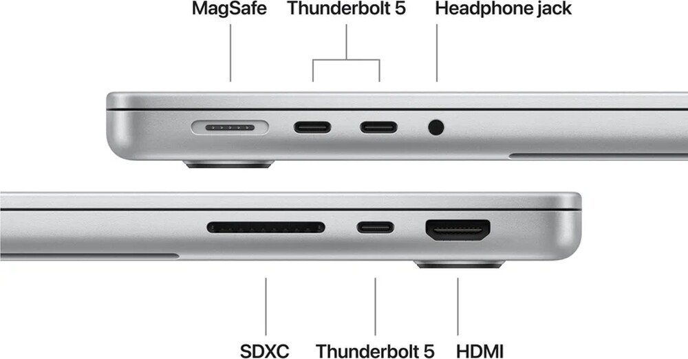 | Разширителен порт: | 3 Thunderbolt 4 (USB-C) ports with support for: Charging, DisplayPort, Thunderbolt 5 (up to 120Gb/s), USB 4 (up to 120Gb/s); MagSafe 3 port |