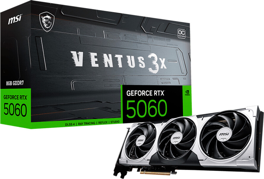 MSI Video Card NVIDIA GeForce RTX 5060 8G VENTUS 3X OC, 8GB GDDR7, 128-bit, 2550 MHz Boost, 3840 CUDA Cores, PCIe 5.0 (x8), 3x D