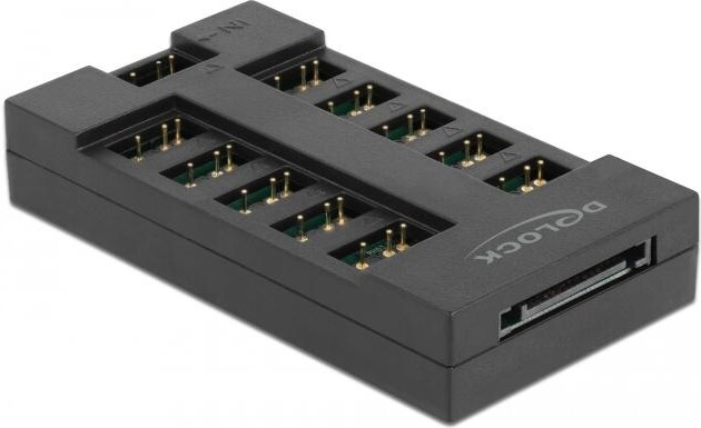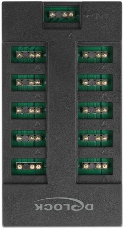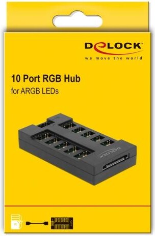 RGB хъб от Delock за разширяване вътрешното LED осветлениеможе на дънна платка с адресируем RGB 5 V конектор. По този начин на един ARGB конектор са налични до 10 порта за индивидуално осветление. Два магнита в долната част, осигуряват добра възможност за монтаж в компютърна кутия.