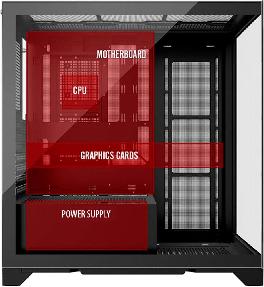 Стилен, персонализиран корпус, вдъхновен от легендарната игра Diablo IV – идеален за допълване на тъмна, атмосферна гейминг конфигурация. С добре планирано осветление, дизайнът оживява в зловещи, огнени нюанси, подчертавайки смелата и потапяща естетика. Освен впечатляващия външен вид, корпусът предлага и отлична функционалност: поддръжка за водно охлаждане отгоре и отзад, ефективно управление на кабели, 360-градусова циркулация на въздуха и просторно вътрешно пространство за гъвкава хардуерна конфигурация.