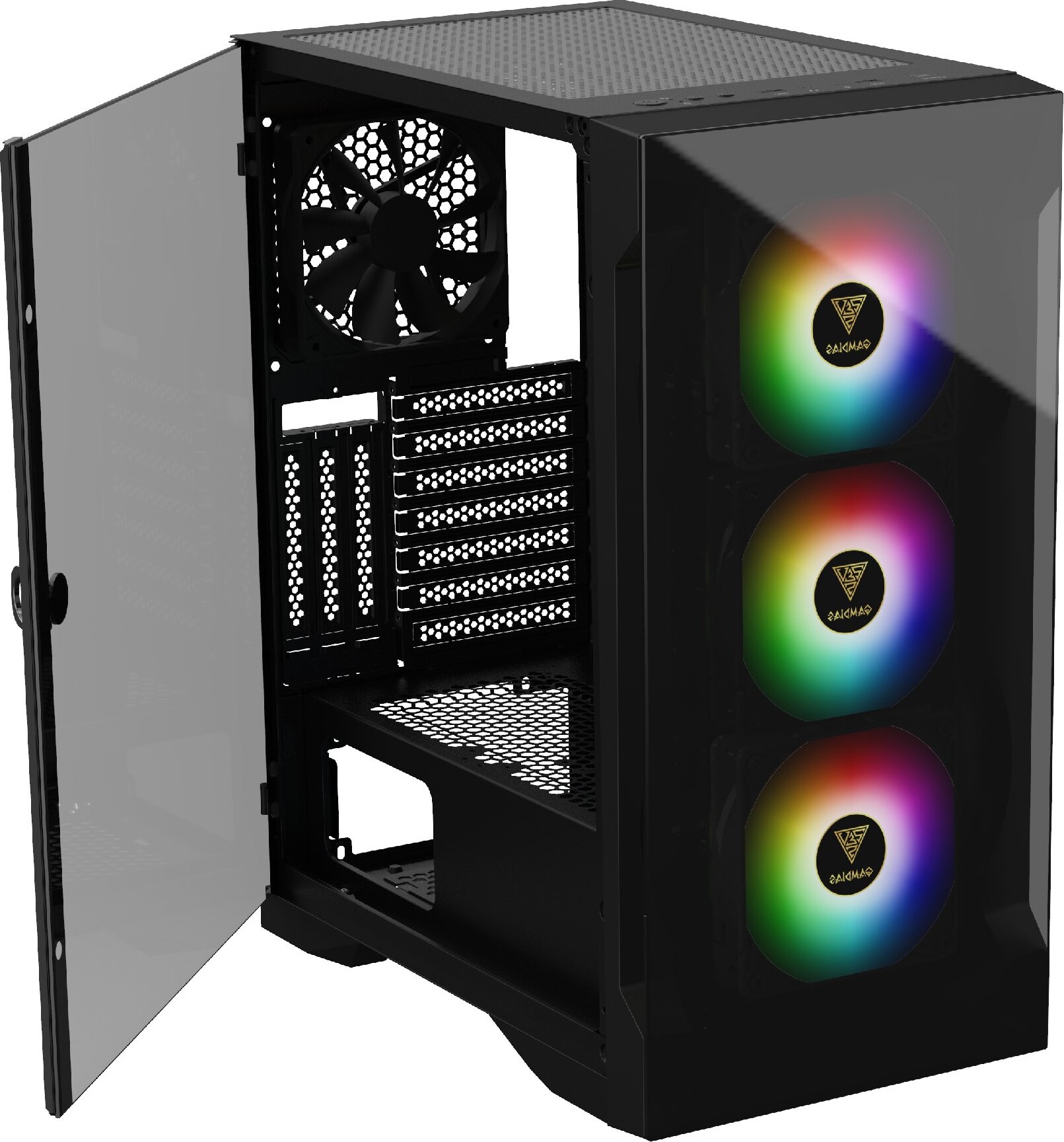 3 Built-in 120mm ARGB Fans Side Swing Magnetic Closing Tempered Glass Window Support RGB Motherboard Sync Software Magnetic Dust Filter One Touch to Easily Switch RGB Streaming Lighting Style, and LED off 3 Slot Vertical VGA Slot