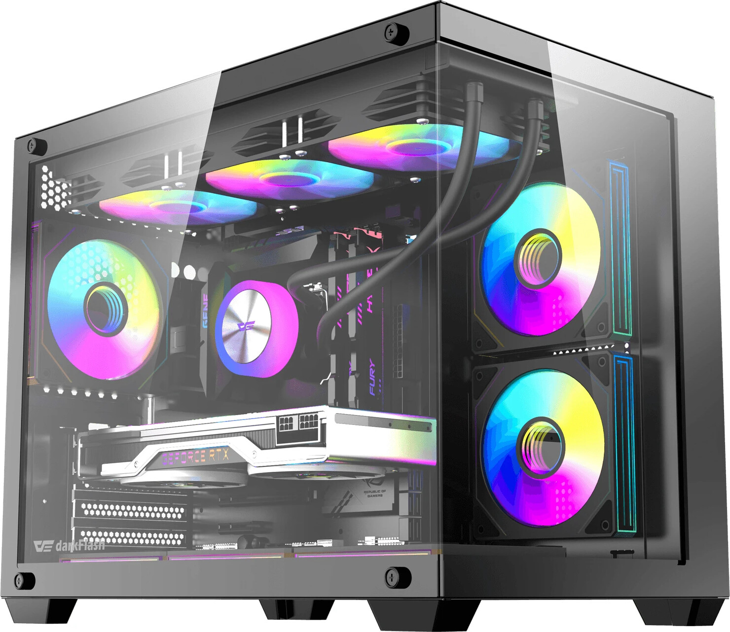 Pillar-less dual glass design provides a seamless 270° panoramic view Accommodates 360mm liquid cooler for maximum performance Tool-free quick-release panels allow for effortless installation and maintenance Optimized airflow layout supports up to 9 fans for superior cooling efficiency