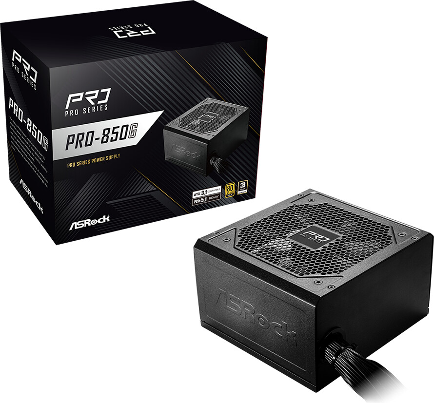 Asrock PRO-850G, 850W, 80 Plus GOLD, Non Modular PSU, 1x EPS 12V CPU(4+4pin), 2x PCIe (6+2pin), 2x 4-pin connectors, 4x SATA, OCP, SCP, OVP, UVP, OTP, OPP protections, 120 mm Fan, ATX 3.1