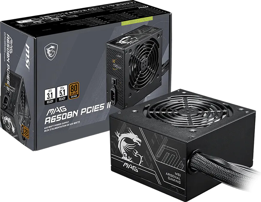 MSI MAG A650BN PCIE5 II, 650W, 80 Plus Bronze, 120mm Low Noise Fan, Protections: OVP/OCP/SCP/OPP/UVP, Dimensions: 150mmx140mmx86