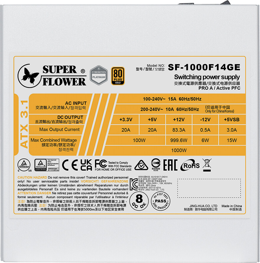 Super Flower Leadex III Gold 1000W ATX 3.1 80 Plus Gold, Fully Modular, Flat White Cables, 140mm Fan, White