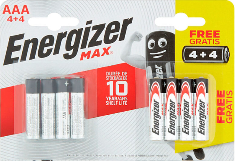 Алкалните батерий Energizer Maximum тип AAA са с 35% по издръжливи от обикновенните алкални батерии от този тип. Подходящи за дистанционни, фенери, фотоапарати и много други електронни устойства. Комплекта съдържа 4 батерии.