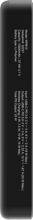 Output QC Specs: DC 5V-2.4A, 9V-2.22A, 12V-1.67A (20 W max.); Output Wireless charge Specs: 5V-1.0A, 7.5V-1.0A, 9V-1.66A (15W)