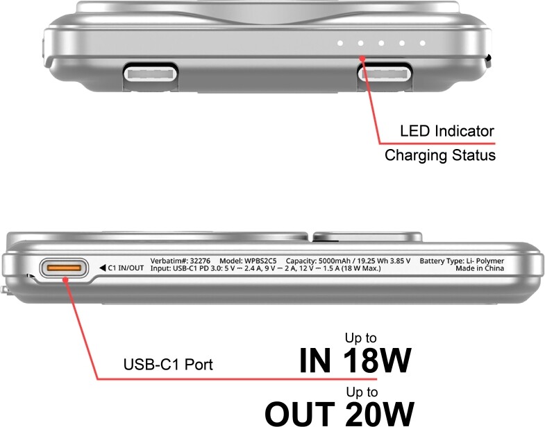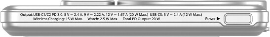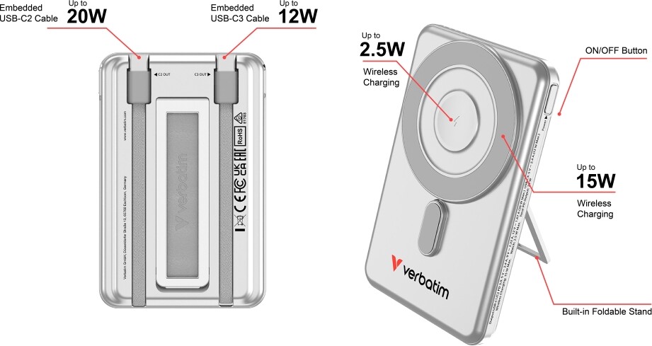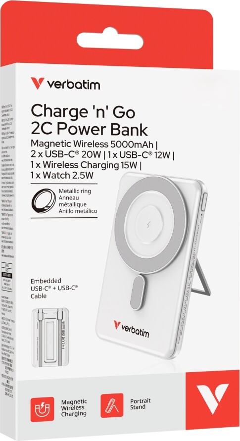 Независимо дали ви предстоят дълги пътувания, уикенд извън града или просто натоварен ден навън, външната батерия Charge 'n' Go 2C с магнитно безжично зареждане гарантира, че устройствата ви ще са винаги готови, когато имате нужда от тях. С капацитет от 5000 mAh тя осигурява надеждно резервно захранване за смартфони, таблети, слушалки и други малки устройства. Тънка и преносима, батерията се побира удобно в джоб или чанта, а вградените двойни USB-C кабели ви гарантират, че винаги ще разполагате с правилната връзка под ръка. Компактна, но устойчива, тази външна батерия е създадена за ежедневна употреба и ви осигурява енергия навсякъде, където ви отведат плановете. Забравете за хаоса от кабели и се насладете на гладко, безкабелно зареждане. Външната батерия Charge 'n' Go разполага с магнитно подравняване, съвместимо с MagSafe за iPhone, като осигурява мощност до 15W за смартфони, 5W за AirPods и 2,5W за Apple Watch. Потребителите на Android могат да се възползват от Qi безжичното зареждане за същото безпроблемно изживяване. Благодарение на вградената стойка можете да гледате, превъртате или стриймвате съдържание, докато телефонът ви се зарежда безжично, за да останете свързани, без да прекъсвате ритъма си. Проектирана с мисъл за максимална функционалност, тази външна батерия има всичко необходимо, вградено в едно устройство. Двата интегрирани USB-C кабела осигуряват бързо и лесно зареждане, като USB-C2 поддържа мощност до 20W и може да зарежда както устройства, така и самата батерия, докато USB-C3 предлага изход до 12W за по-малки устройства. В комбинация с 20W USB-C порт можете да захранвате няколко устройства едновременно, без нужда от допълнителни аксесоари. Компактна, практична и изключително ефективна - Charge 'n' Go прави зареждането ви лесно, подредено и оптимизирано.