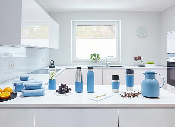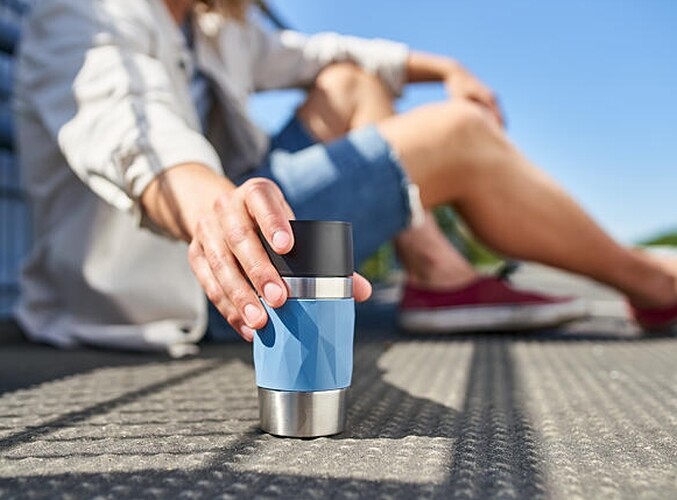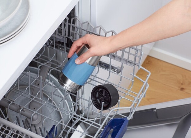 With double-walled stainless-steel liner; Opens with the press of a button; 360° drinking from all sides; 100% leak-proof; Dishwasher safe; Closure can be taken apart for easy cleaning