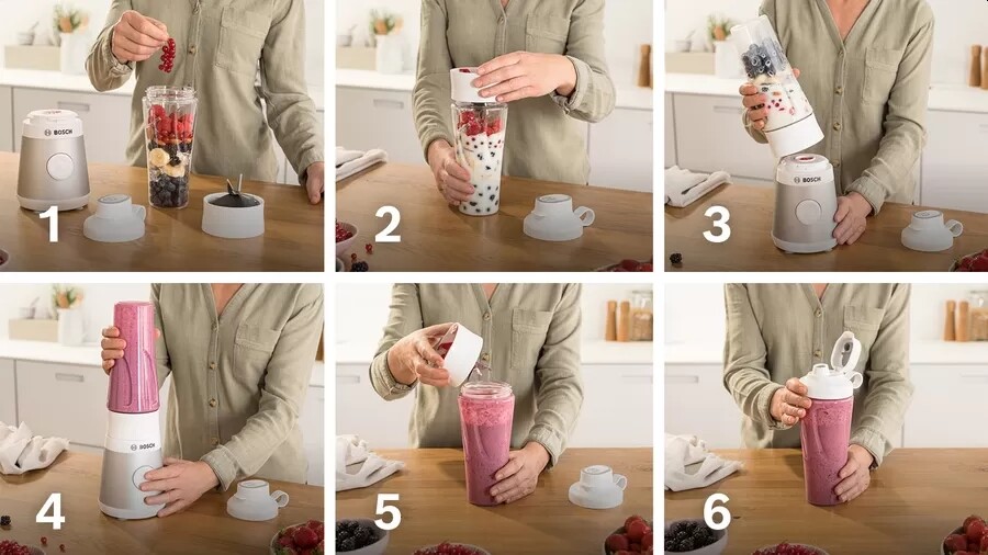 Компактният и мощен мини блендер с непропусклива бутилка Tritan ToGo. Насладете се на здравословни смутита без парченца благодарение на високоскоростния блендер. Pro Performance System: оптимална текстура и перфектно свеж вкус за вашите смутита дори със замразени плодове и твърди съставки. High Bosch motor competence: мощен мини блендер с 450 W и до 40 000 оборота в минута ProEdge ножове: гладки резултати с ефективни и издръжливи остриета от неръждаема стомана - made in Germany. Качество, произведено в европейската фабрика на Bosch: издръжлив, надежден дизайн и висококачествени материали. Смесете директно в бутилка ToGo със защита от течове: наслаждавайте се на смутита в движение лесно и без грижи.
