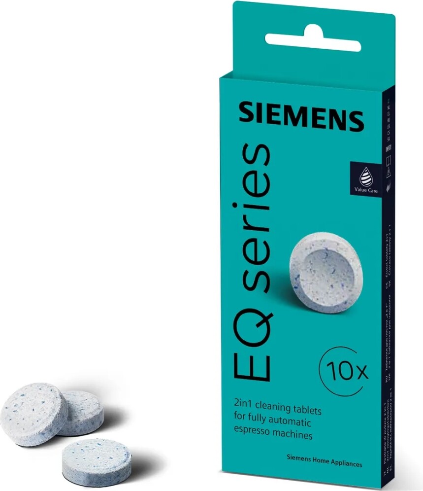 Почистващи таблетки – премахват лесно остатъците, осигуряват най-добър аромат на кафе и дълъг живот. Siemens Value Care – почистването гарантира най-добър вкус. Внимателно почистеното устройство позволява на аромата на кафето да се разгърне напълно. Мощните почистващи таблетки Siemens Value Care премахват бързо и надеждно всички видове остатъци, като масло от кафе. Вашето устройство работи винаги на оптимално ниво, с минимални усилия. Резултатът: дълъг експлоатационен живот и продължително удоволствие от кафето. Постоянно тествани от нашите инженери, оригиналните почистващи таблетки на Siemens осигуряват пълната програма за грижа за вашата напълно автоматична еспресо машина.