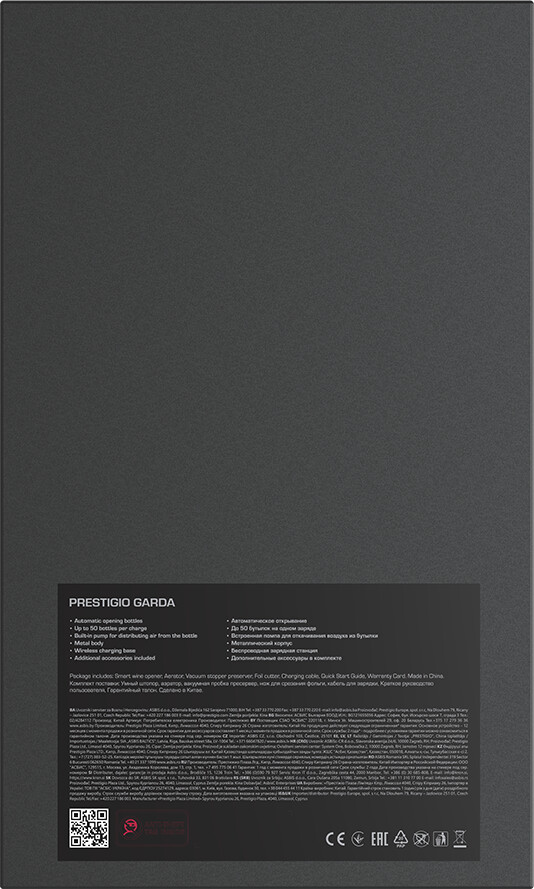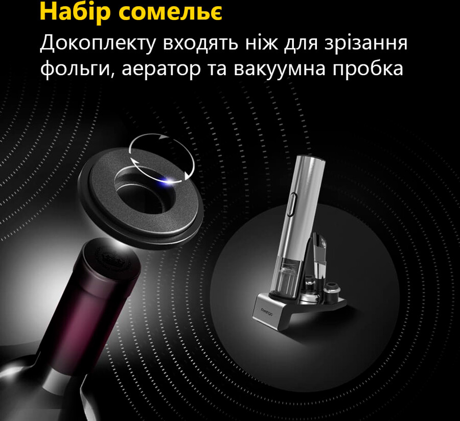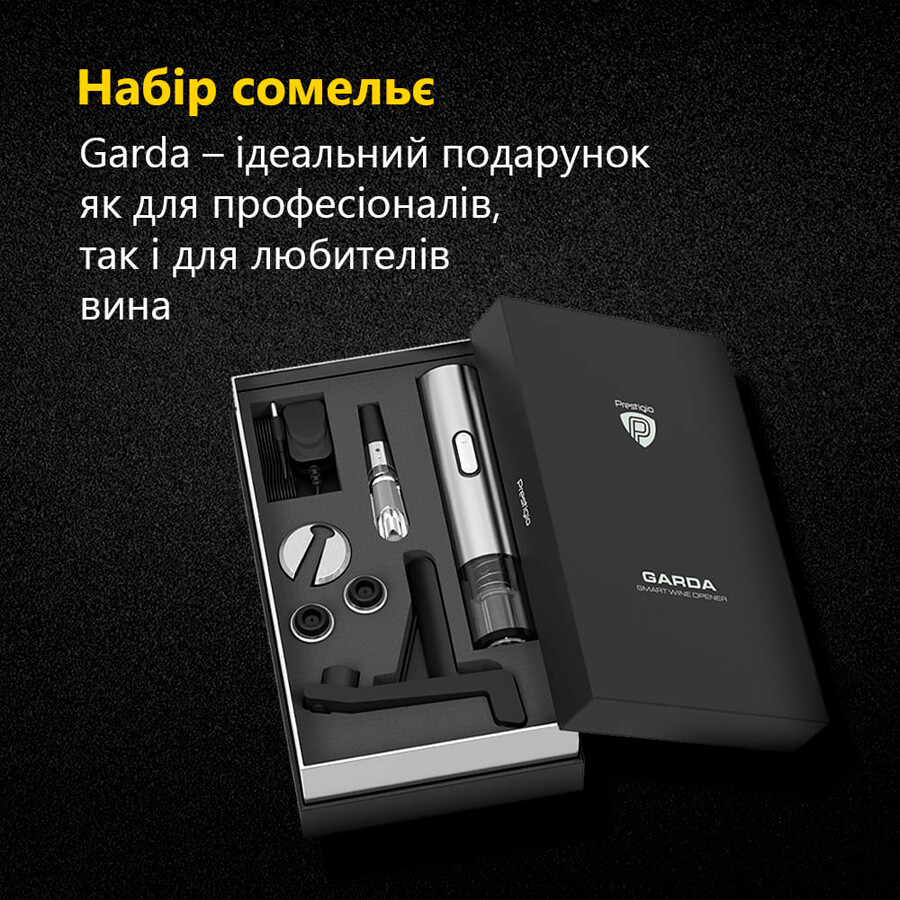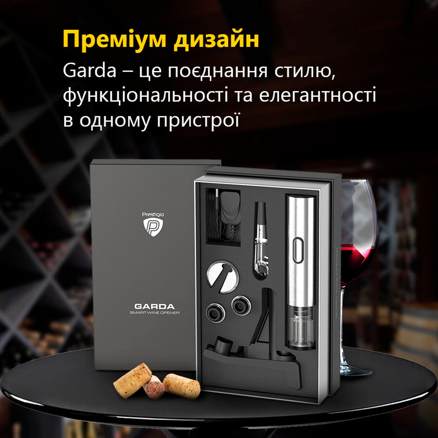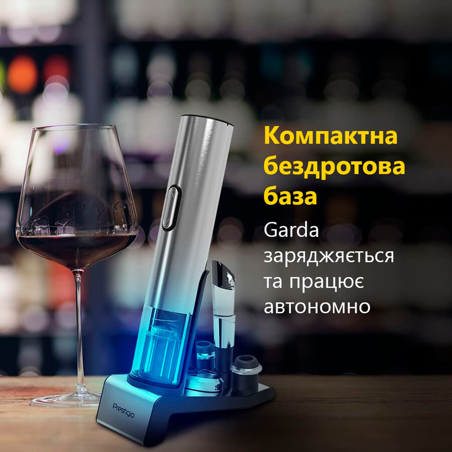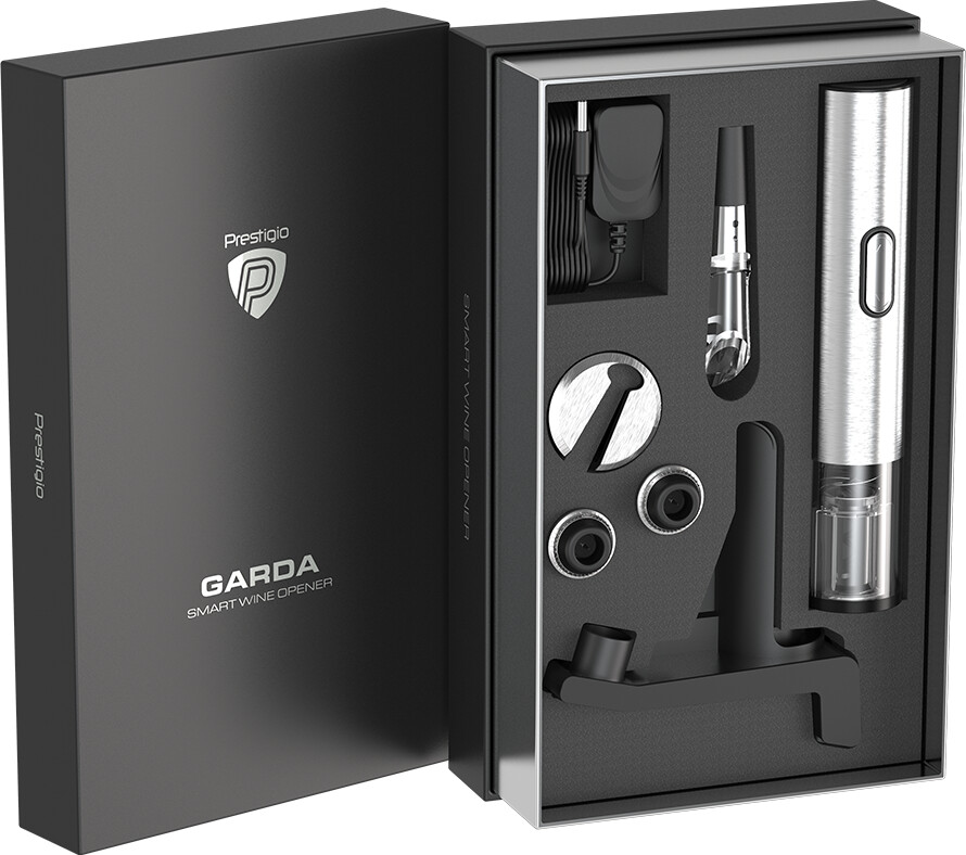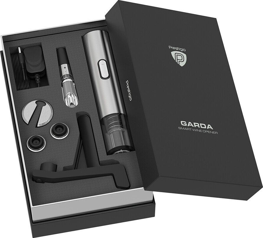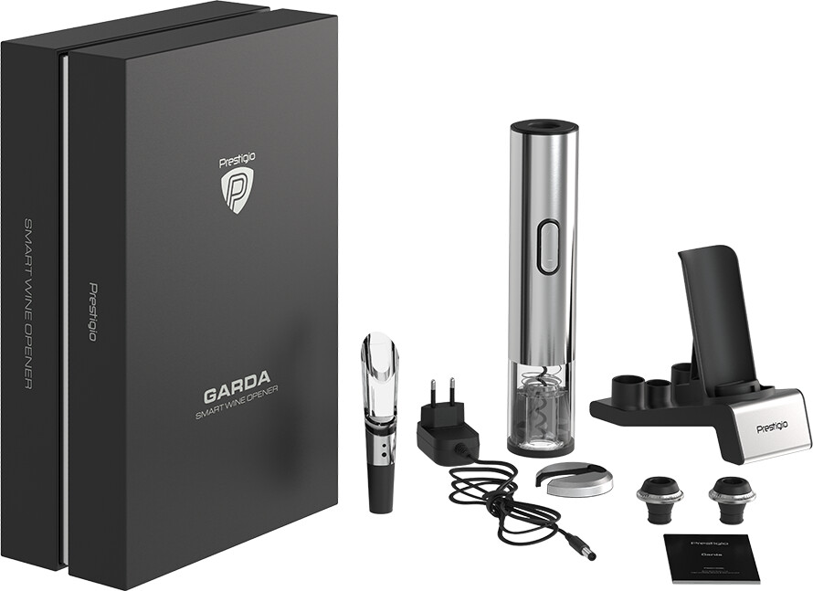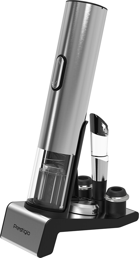 Prestigio Garda, smart wine opener, simple operation with 2 buttons, aerator, vacuum stopper preserver, foil cutter, opens up to