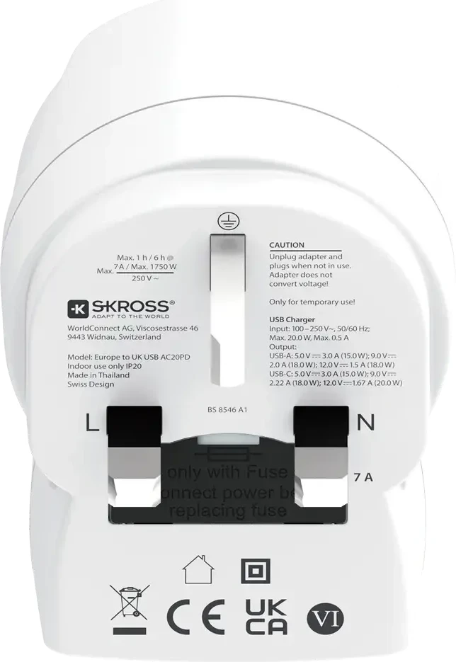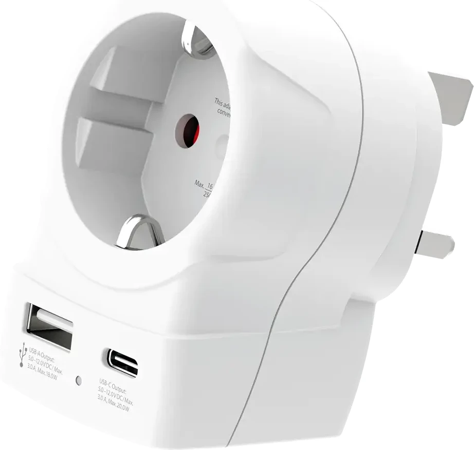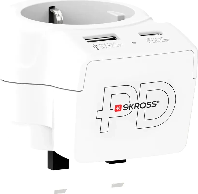 Skross универсален адаптер Europe to UK + 1 x USB A/C порт, 20W 1500283E