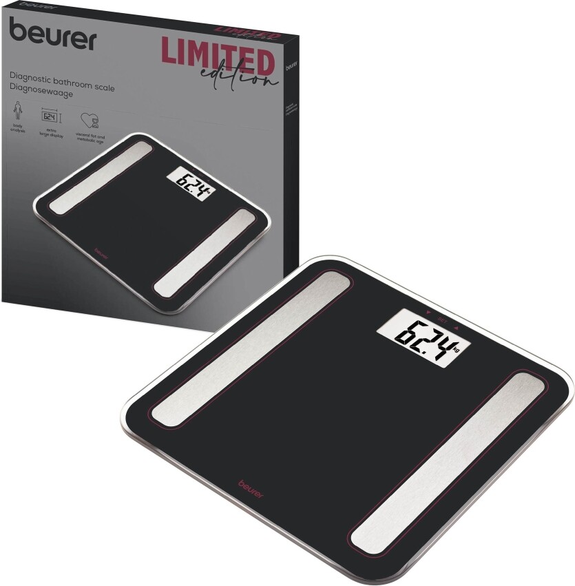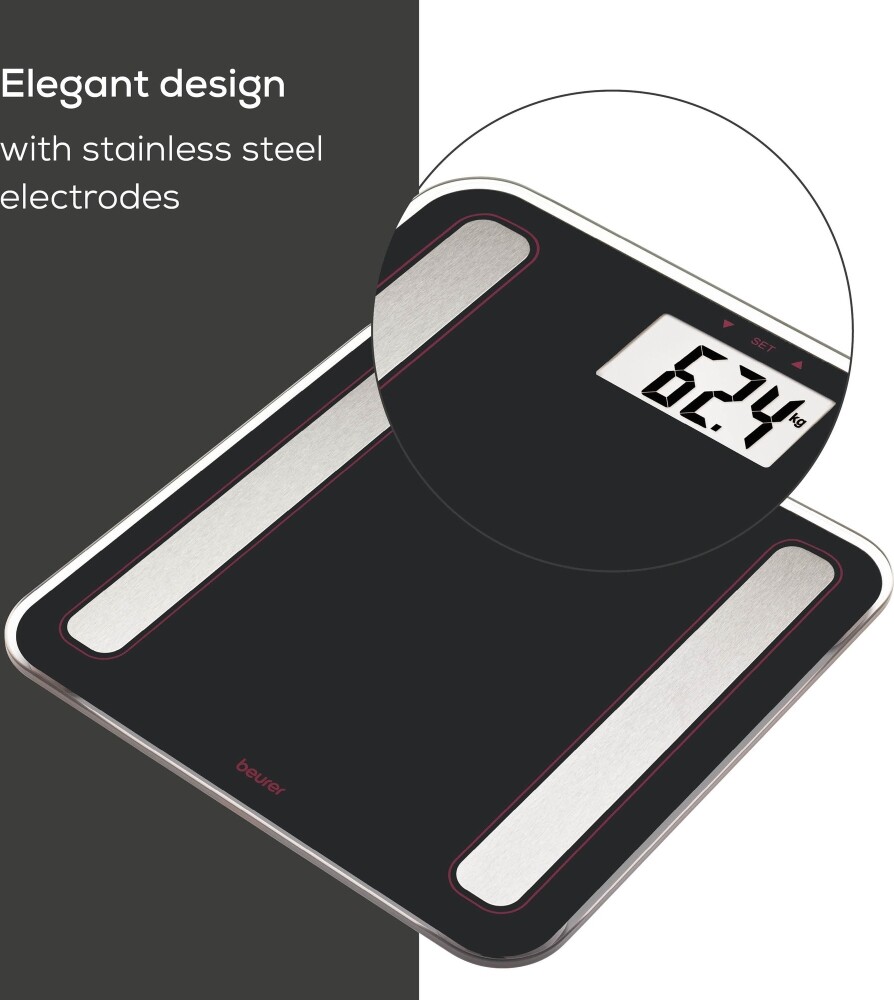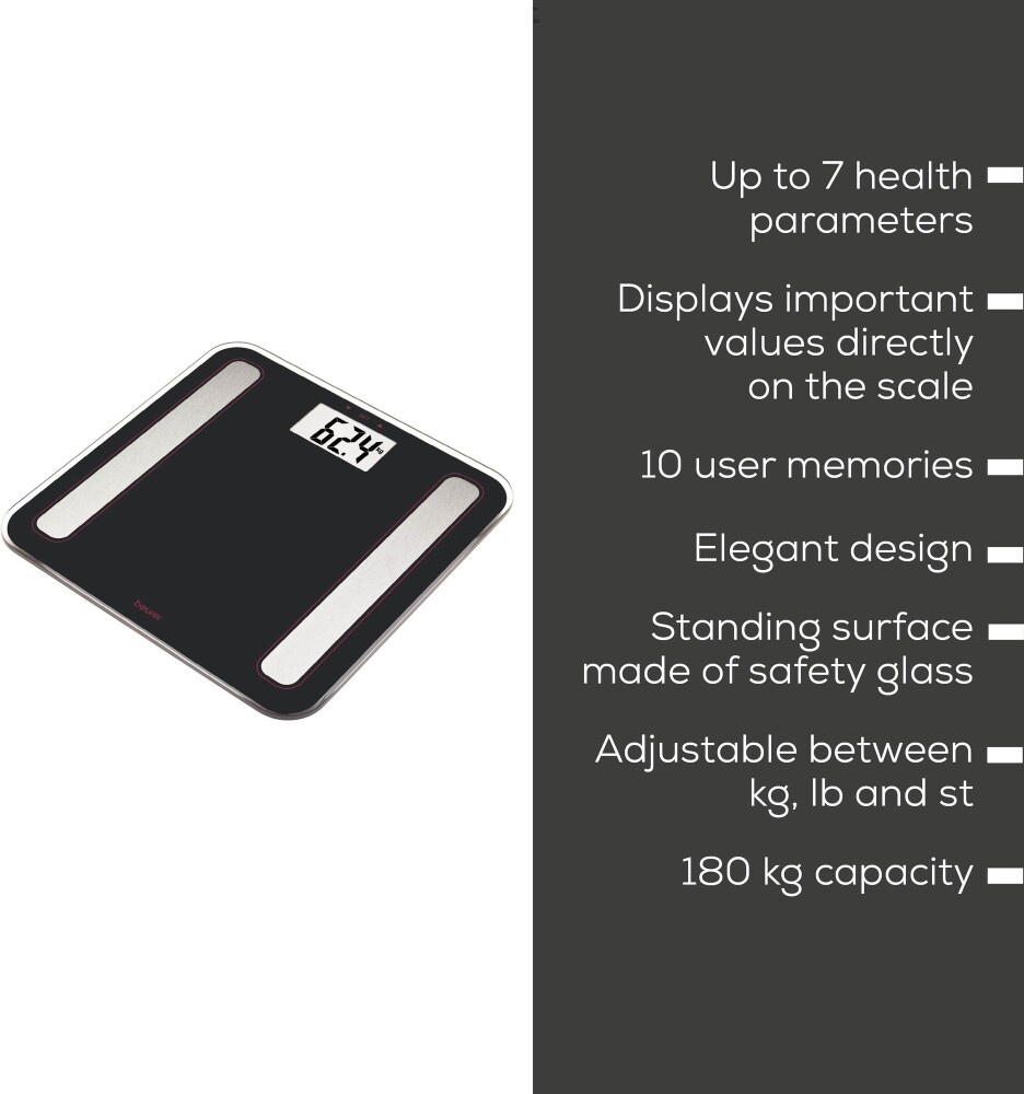 Beurer BF 183 LE 2025 е висококачествен диагностичен кантар, който измерва вашата висцерална мазнина и метаболитната ви възраст. Кантарът разполага с големи цифри с размер от 38 мм, електроди, които са направени от неръждаема стомана и зона за измерване, която е направена от закален стъкло с дебелина 6 мм. Този кантар може да измери вашите ИТМ, метаболитна възраст и висцерална мазнина, теглото и мускулната ви плътност. Измерването може да бъде направено в една от трите мерни единици - kg/lb/st - според личните ви предпочитания. Beurer BF 183 LE 2025 разполага с 10 отделни потребителски памети, индикатор при претоварване и автоматично включване и изключване.