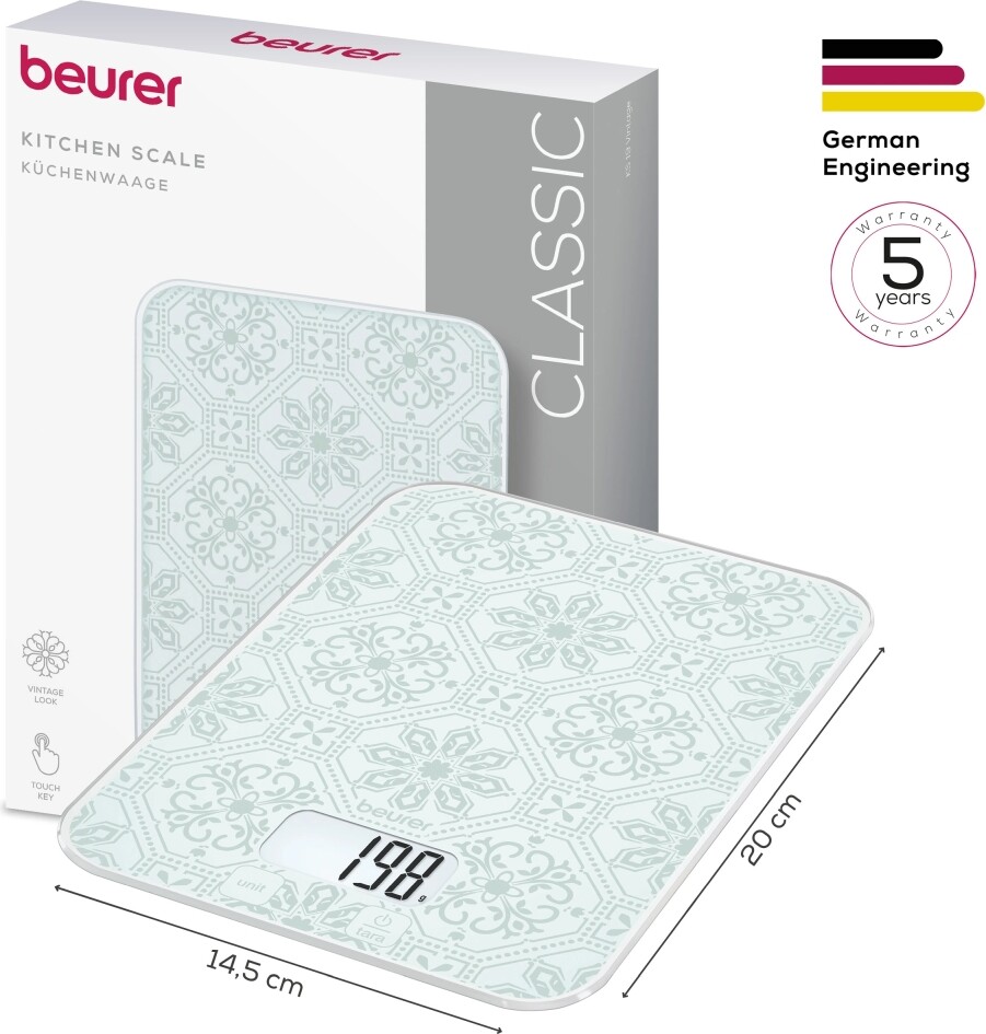 Beurer KS 19 Vintage впечатлява със стилна стъклена повърхност и уникален винтидж дизайн, който придава характер и елегантност на всяка кухня. С ултратънък профил от само 16 мм, везната заема минимално пространство и се съхранява лесно. С практичната функция тара и сензорно управление с докосване, тя е идеалният помощник при готвене и печене. Големият и лесен за разчитане LCD дисплей гарантира яснота при измерванията, а гладката стъклена повърхност се почиства бързо и без усилие, съчетавайки стил и функционалност в едно.