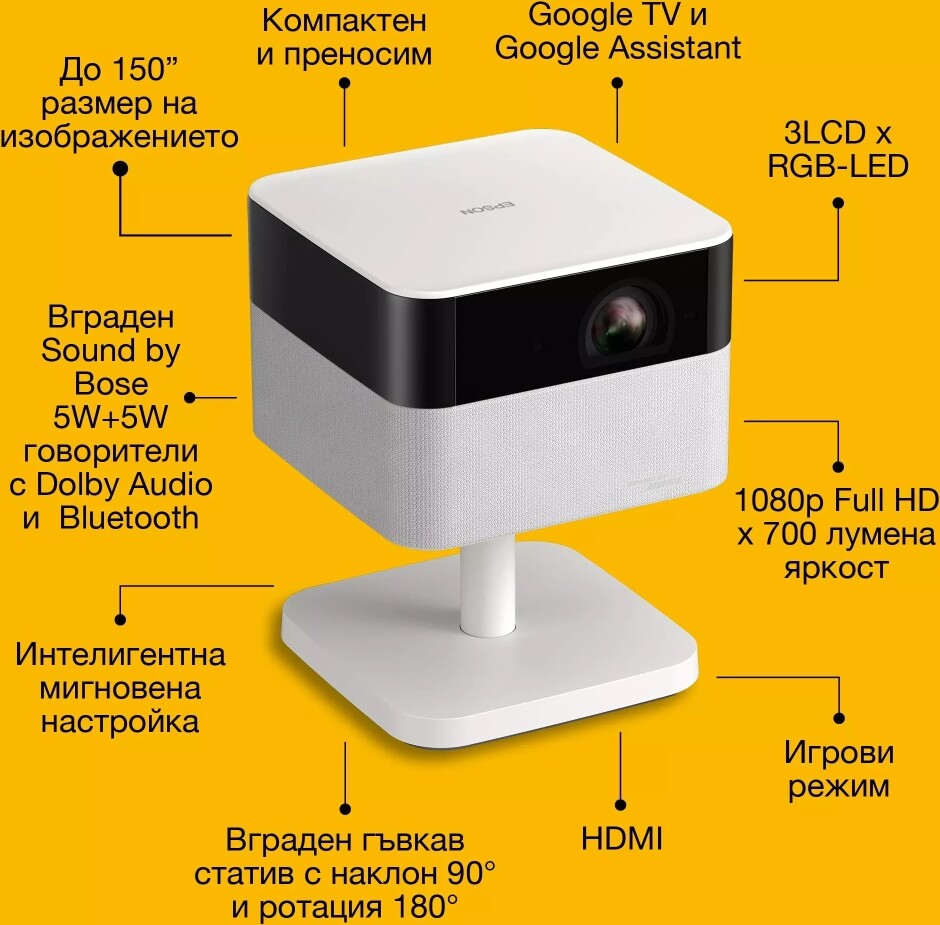 Преносим smart проектор, Sound by Bose, Google TV, Full HD, 700 лумена, 3LCD x RGB-LED, регулируема стойка, настройка без усилие, употреба на закрито и на открито. Насладете се на наистина завладяващи моменти с преносимите smart проектори Epson Lifestudio. Елегантни, компактни и заредени с функции, те са проектирани с усъвършенствана, най-съвременна технология за изображения и аудио, вградени функции за smart TV и лесна настройка за безпроблемно завладяващо забавление на закрито и навън.