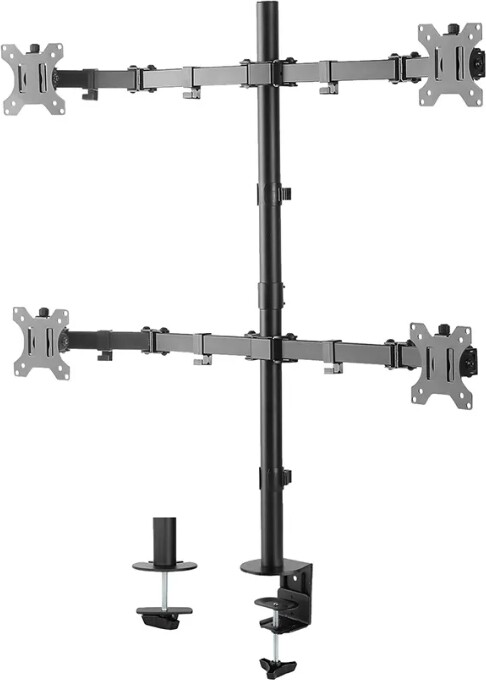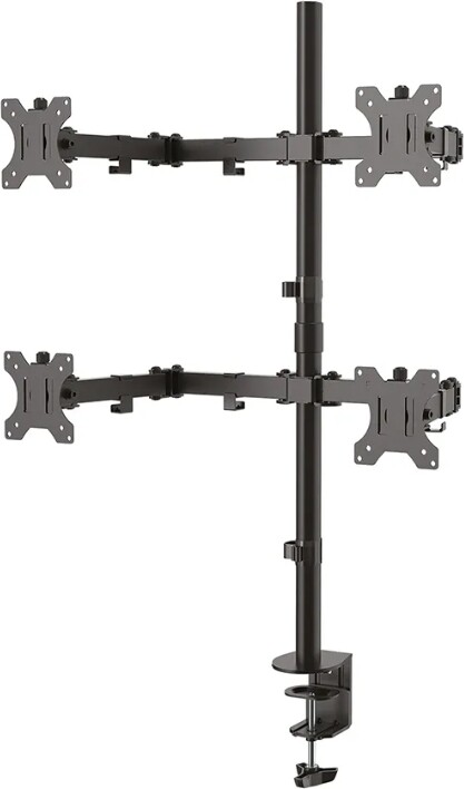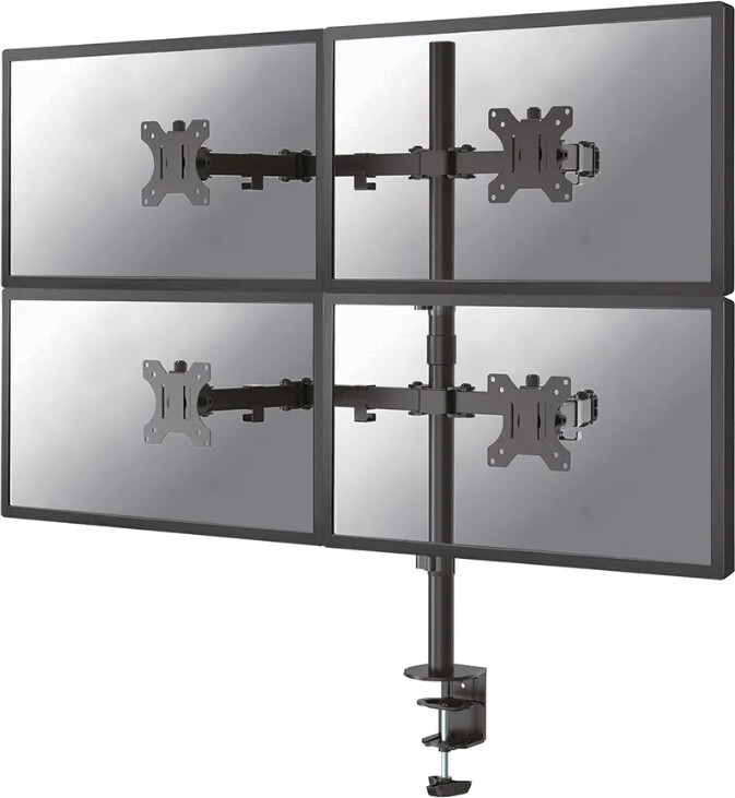 FPMA-D550D4 е напълно подвижна стойка за бюро за четири плоски екрана до 32 инча. Тя има максимален капацитет на тегло от 6 килограма за всеки екран. Гъвкавата технология за накланяне (90°) и завъртане (360°) позволява на стойката да се променя към всеки ъгъл на гледане, за да се възползвате напълно от възможностите на плоския екран. Освен това може да регулирате височината (0-85,7 см) и дълбочината (0-38,2 см) на стойката, така че да работите по възможно най-удобния за вас начин. Интелигентните щипки за управление на кабелите ви осигуряват правилна и удобна подредба на кабелите. Освен това стойката разполага с VESA с лесно освобождаване, което ви позволява да закачите и разкачите мониторите бързо и лесно. Стойката е подходяща за екрани, които отговарят на VESA шаблон с отвори 75x75 или 100x100 мм. Различните модели на дупки могат да бъдат покрити с помощта на адаптерни плочи Neomounts by Newstar VESA.