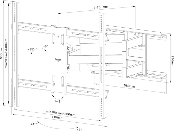WL40S-950BL18 е напълно подвижна стенна стойка от Newstar, която е перфектният избор за плоски екрани до 110 инча. Тя има максимален капацитет от 125 килограма. Универсалната технология за накланяне (20°) и завъртане (90°) ви позволява да променяте ъгъла на гледане, за да се възползвате напълно от възможностите на плоския екран. Дълбочината на стойката е от 8,2 до 70 сантиметра. Тази стойка е подходяща за екрани, които отговарят на VESA модел на отворите от 800х600 до 1200х900 мм.