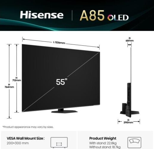Телевизор Hisense 55" A85Q, 4K UHD OLED Smart TV, 120Hz, 1000 nits,HDMI 2.1, Game Mode Pro, AMD FreeSync Premium, Dolby Vision I