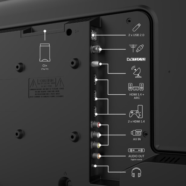 | Изводи за свързване: | 3 HDMI, 2 USB, CI+, AV IN, SPDIF coaxial, HEVC/H.265 |