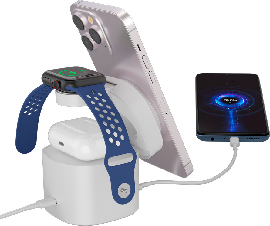 The OnCharge 405 is a compact, all-in-one wireless charging stand for those who need to power multiple devices without clutter or compromise. With Qi2-certified 15W magnetic fast charging for iPhones and support for AirPods and Apple Watch, it keeps your essential gear powered in one neat, efficient space.