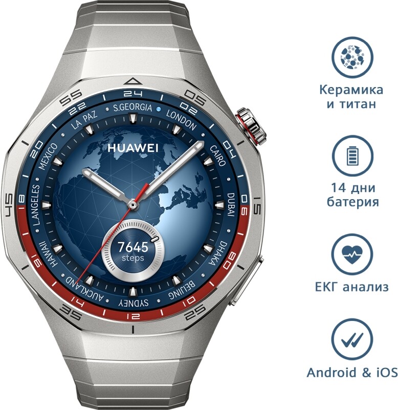 Huawei GT5 Pro е най-новото предложение на Huawei, което ви гарантира, че ще бъдете с крак с физическото си здраве, докато се наслаждавате на часовник с красив и модерен дизайн. Този часовник е изработен с грижа до последния детайл от супер качествени материали. Той има осемстранен панел от титаниева сплав, нано кристално керамично тяло, екран от сапфирено стъкло и панел и корона, които са полирани до съвършенство. Всички тези изпипани докрай негови детайли ви гарантират, че това ще бъде най-красивият смарт часовник, който сте носили някога. Huawei GT5 Pro има супер издръжливо покритие на корпуса и екрана си и водоустойчиво покритие с нано филм, което ви осигурява невероятна устойчивост на надраскване, намокряне и дори на корозия. Освен това този часовник има IP69K, което значи че ще издържа на бързо течаща вода безпроблемно. Този часовник може да се похвали и с 13 нови циферблат предложения с различен по вид дизайн - както спортен, така и модерно-елегантен. Huawei GT5 Pro има оптимизиран интерфейс, който ви помага да навигирате менюто му с лекота, тъй като има цветно кодирани приложения, опростени икони и интуитивни преходи. Освен това той разполага с вградена Bluetooth функционалност, която ви позволява да приемате и да извършвате телефонни обаждания, докато го носите удобно на китката си. Този часовник разполага с редица фитнес режими, които ви помагат да следите физическата си форма и да постигнете желаните от вас фитнес резултати. Освен това този часовник ви помага да бъдете в крак с психичното си здраве, благодарение на иновативното приложение за емоционално благополучие, което използва данни от HUAWEI TruSense, така че винаги да знаете как се чувствате в момента.