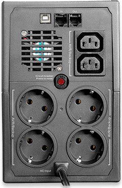 | Output | Voltage (DC mode):220/230/240Vac +/-10%; Frequency:50/60Hz +/-1Hz; Waveform:Simulated Sinewave; Steps of Regulation:II Boost + I Buck; Transfer Time:<6ms typical; Socket:Schuko*4pcs + IEC320 C13*2pcs for Back-up/AVR/Surge |