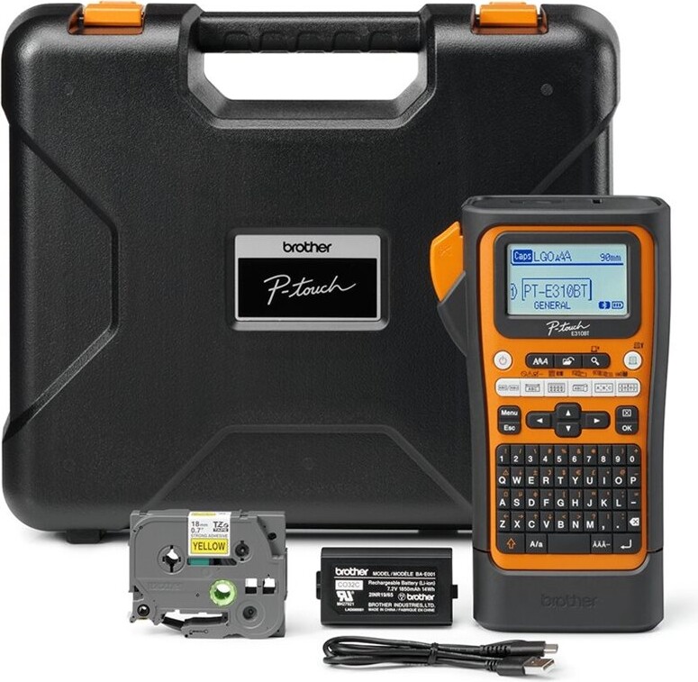 - Включва касета с лента, акумулаторна литиево-йонна батерия, USB кабел и куфарче за пренасяне